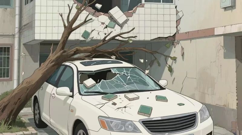 被脱落的瓷砖和枯树砸中